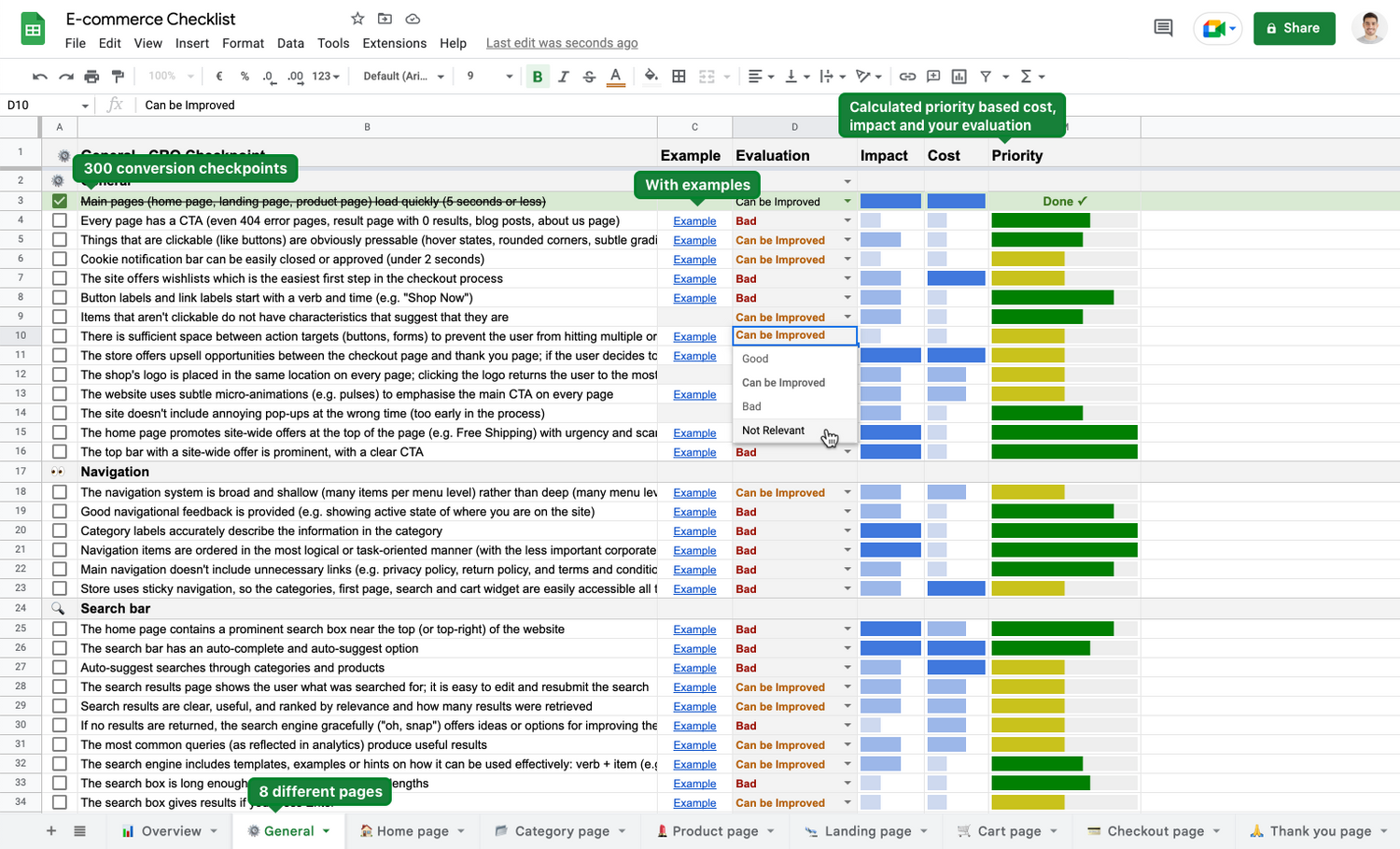 My E-commerce Conversion Checklist includes over 300 essential checkpoints, ensuring you thoroughly examine every aspect of your store's conversion process.